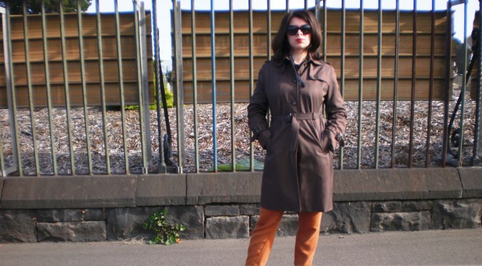 Wearing: Gorman ochre high-waisted pants (my, I forget how comfortable tencel is!), David Lawrence chocolate trench, Dolce & Gabbana sunglasses.