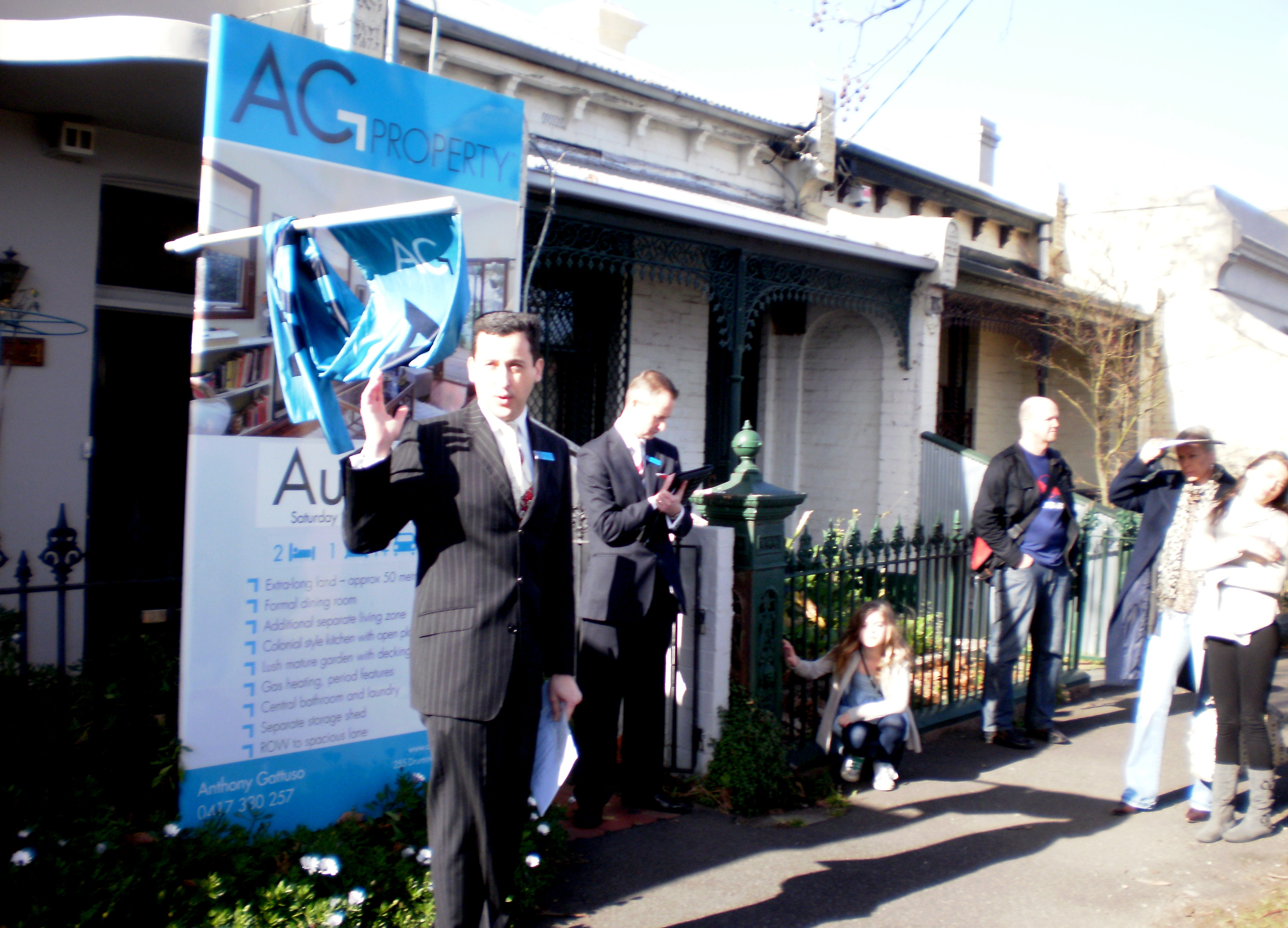 Review: This property was located opposite the Melbourne General Cemetary, in that classic long row of Victorian workman’s cottages. This home had been very well lived in and very well loved, it had oodles of charm. Two bedrooms with high ceilings, formal lounge with bright views to a miniature winter-garden, huge bathroom and modern kitchen with atrium-style casual lounge attached. The owner must have really loved their garden, because it was full of verdant trees, mature plants and had a nice decking area. The block was quite long, and when you ventured to the end of the garden, you discovered a little park. Anthony Gattuso (Director of AG Property) was both the listing agent and the auctioneer for this campaign. A stalwart of the Carlton and inner-north, Anthony made much of the value and location of this home. As he said ‘… demand will always outstrip supply in these inner-city areas, as they will not be building homes like these again’. He also reinforced to the bidding crowd the clarity of the auction process, and how being able to compete in public was a benefit to buyers. Anthony started off the auction with a vendor bid of $690,000 and swiftly a live bid of $700,000 was called. There were two main bidders in the fray (both very polite and deferential) who kept the bidding in 10,000 rises until they reached $800,000 where they were knocked down to $5000 rises. The property was on the market at $800,000 and eventually sold for $830,000. The crowd were amused by Anthony’s relentless insistence that the competing bidders should keep going, even asking for lower bids such as $1000 and $500. As he said ‘It’s only money… the bank’s got lots!’ A happy auction all in all.