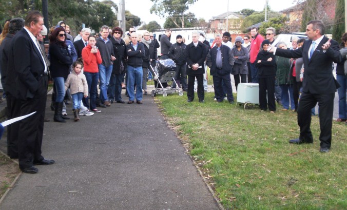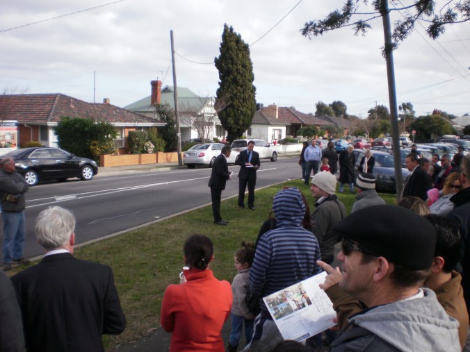Punters: For the first time in a few weeks, I saw happy, positive and non-grumpy buyers. Hallelujah! Sometimes a nice house attracts nice people – nice vendors, nice agent, nice buyers. 774 Lygon Street’s auction was a karmic love-in of decent treatment and respect shown between all parties. It was a mature crowd, mostly families and older people – the auction crowd numbered around 30 punters.