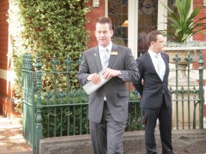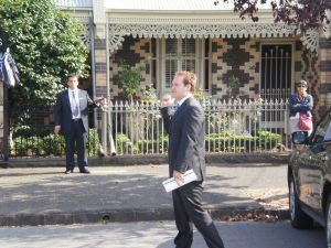 Inset: James Keenan (holding notepad) and Tom Roberts rain-dancin’ the showers away towards a successful sale at 38 Rathdowne.