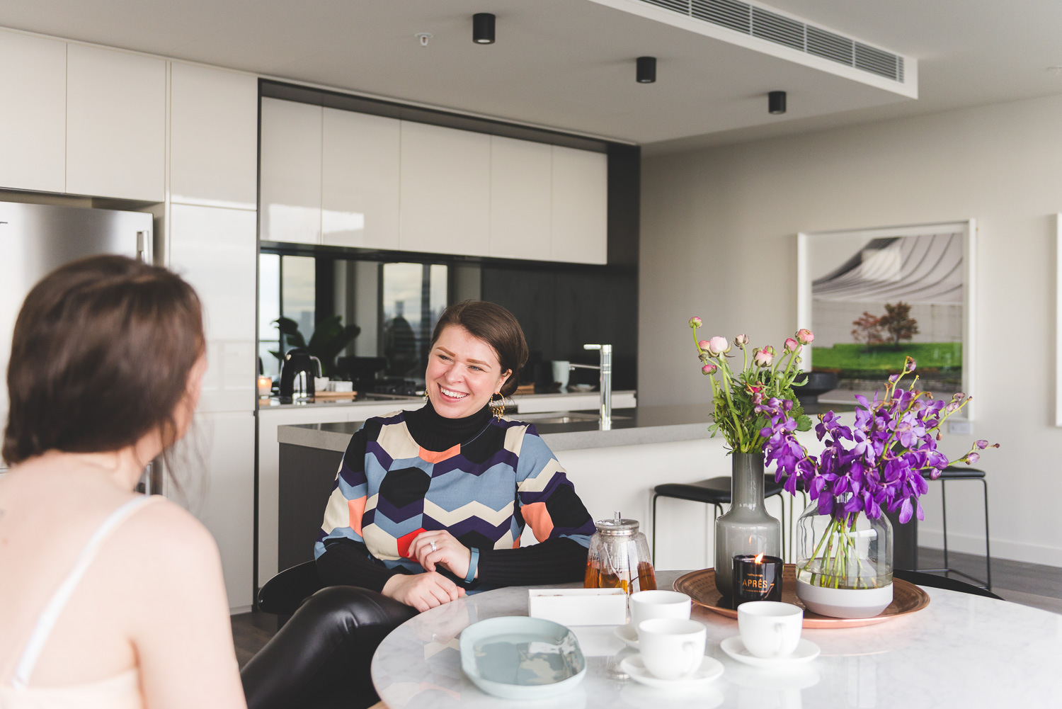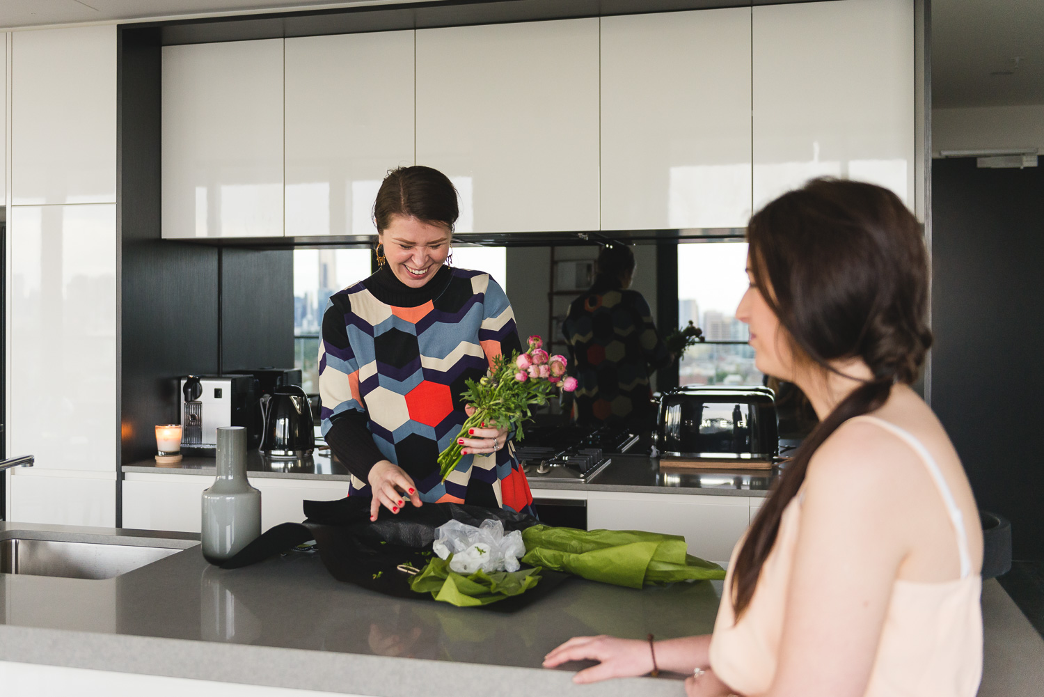 Coffee? Check. Exercise. Done. Browsing, flowers and sweets? Tick, tick, tick – that’s what we call a perfect ’10 Minute Suburb’ location! Now back at our apartment it’s time to arrange those beautiful pink Victoria Whitelaw ranunculus and pop the kettle on.