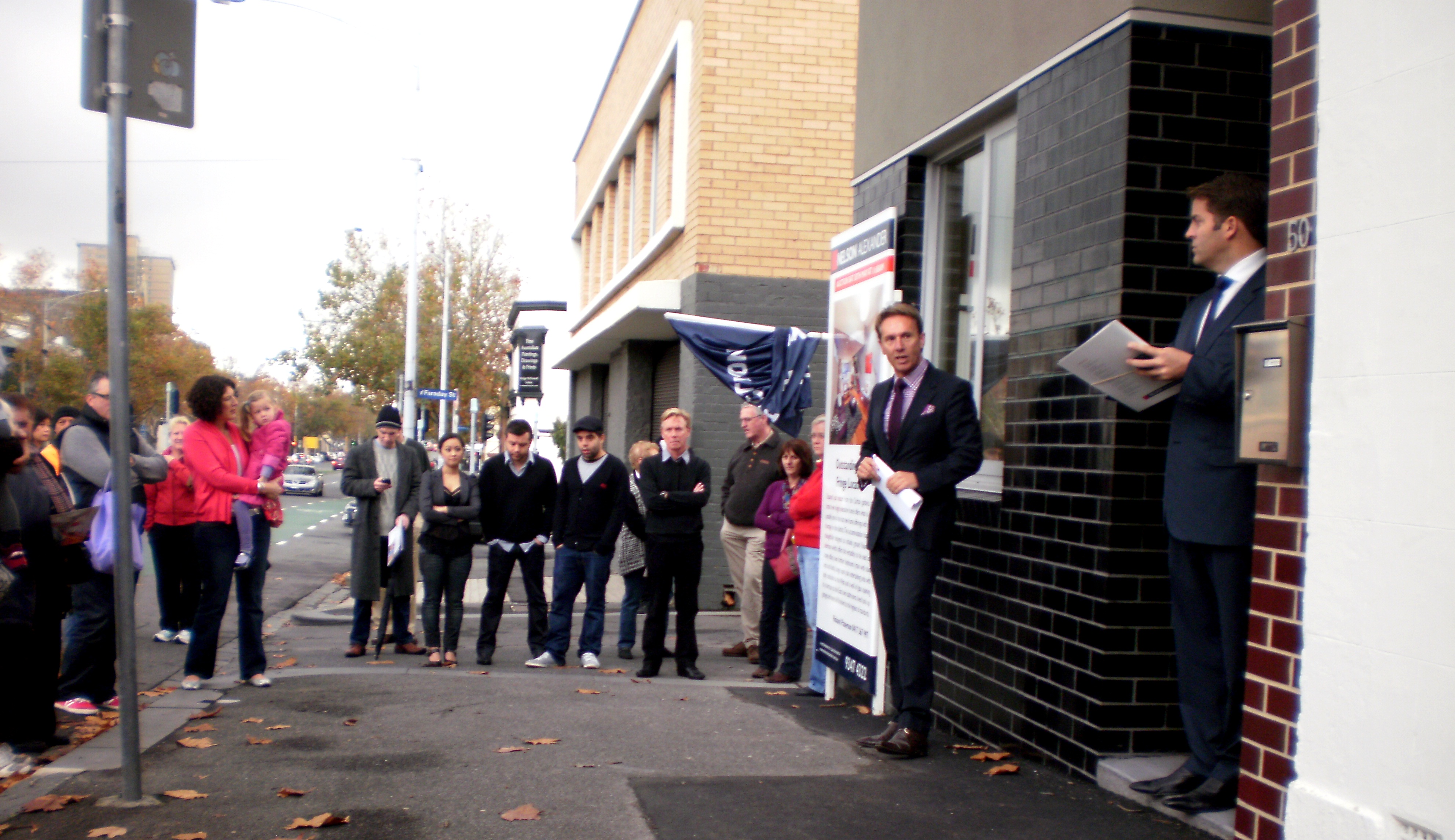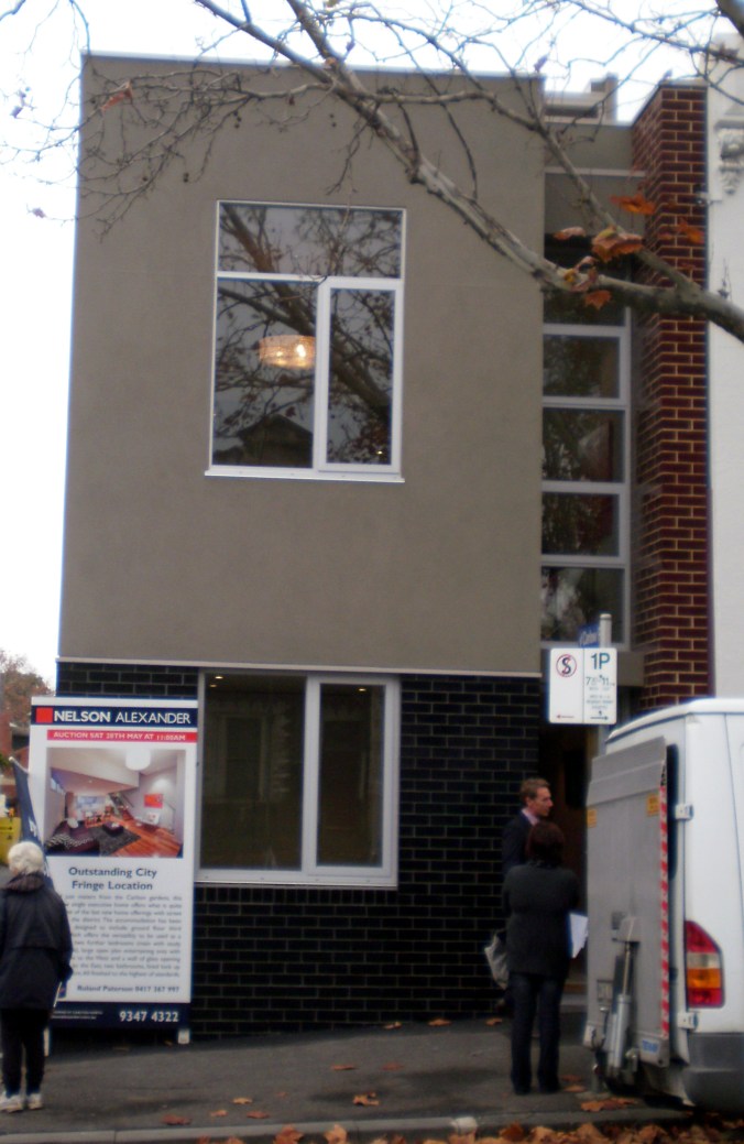 Punters: As you can see, there were lots of ’em! Carlton Street is Carlton’s most prestigious location, overlooking the Carlton Gardens and consisting of exceptionally beautiful gold-rush era Melbourne architecture. Some of the homes are a little decrepit, but (like Elizabeth Taylor) some things just get better with age. The crowd consisted of several genuine bidders, lots of families and a few Carlton identities.